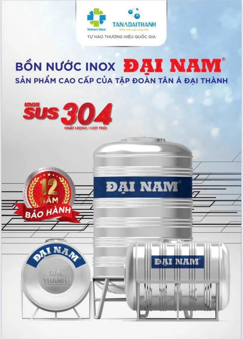 Bồn inox Đại Nam 3000L đứng là dòng bồn nước cao cấp của Tập đoàn Tân Á Đại Thành, sản xuất từ inox SUS 304 an toàn, bền bỉ, đáp ứng nhu cầu trữ nước sinh hoạt cho gia đình đông người, nhà trọ, quán ăn, công trình dân dụng.