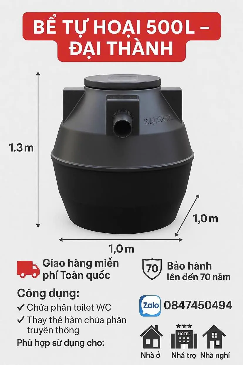 Bể tự hoại 500L chứa một số khối lượng nước thải lớn của gia đình bằng cách chặn các chất rắn và các chất hữu cơ trước khi thải ra môi trường.